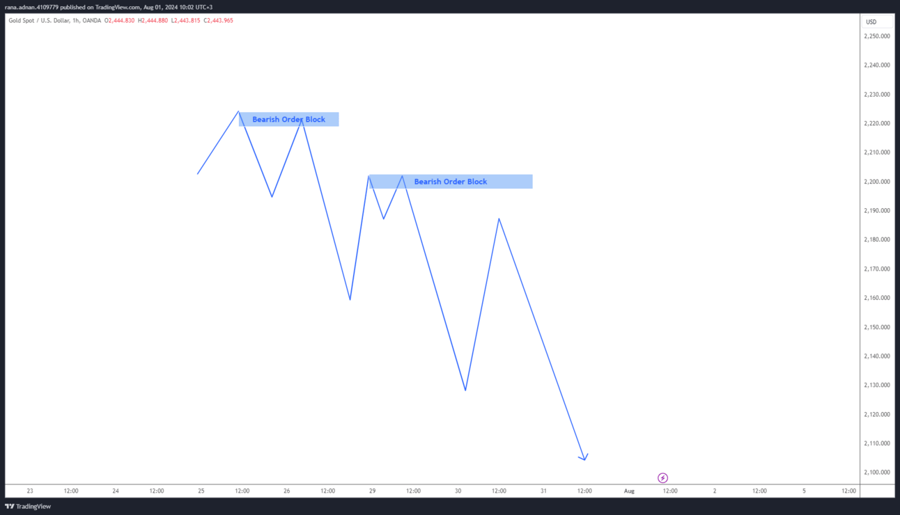 This is a price range where a large quantity of selling has happened. It typically forms during an uptrend before a sharp downward fall. A bearish order block shows that institutional traders accumulated short positions, resulting in a price decline.